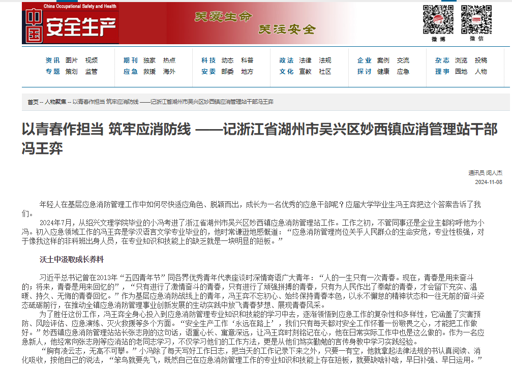 今年9月,台风“贝碧嘉”和“普拉桑”相继来袭,给湖州市的应急管理工作带来了巨大挑战。在这场与时间赛跑的战斗中,冯王奕毫不犹豫地冲在了最前线。他冒着倾盆大雨,对山塘水库、低洼地带等关键区域进行了全面的安全巡查。当得知一名游客在深山腹地迷路时,他更是毫不犹豫地加入了救援队伍。经过近1个小时的紧张搜寻,他们终于找到了迷路的游客。在下山途中,冯王奕不慎摔倒受伤,但他强忍着疼痛,坚持将游客安全护送下山。这次经历,不仅让他深刻体会到了作为一名应急人的价值和荣耀,也让他更加坚定了自己的信念和追求。吴兴区应急管理局也看到了这位年轻人的闪亮之处。区应急宣传教育中心主任闵人杰对冯王奕这位应急条线上的年轻人进行了采访,将他的故事写成《以青春作担当 筑牢应消防线——记浙江省湖州市吴兴区妙西镇应消管理站干部冯王奕》发表在《中国安全生产》网站上。从迈出校园初入职场时的迷茫与困惑,到逐渐成长为一名能够独当一面的应急干部,他经历了无数的挑战和考验。就像冯王奕自己说的那样:“青春是用来奋斗的,只有进行了激情奋斗的青春,才会留下充实、温暖、持久、无悔的青春回忆。”
