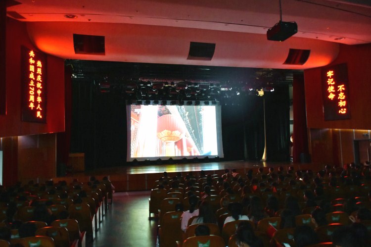 今天是10月1日国庆节,是新中国成立70周年国庆纪念日。上午10时许,庆祝中华人民共和国成立70周年大会在北京天安门广场隆重举行,中共中央总书记、国家主席、中央军委主席习近平发表重要讲话。庆祝大会后,盛大的阅兵式和群众游行举行。为确保第一时间及时了解掌握庆祝大会盛况、认真学习领会习近平总书记重要讲话精神,学院领导沈红卫、石旭明和在校师生齐聚国际文化交流中心报告厅,满怀激情守候在大屏幕前,全神贯注观看庆祝大会现场直播盛况。广大党员干部职工也心潮澎湃,纷纷通过广播、网络、电视、校园LED屏等媒体高度关注庆典盛况,共同为共和国庆生,祝福伟大祖国母亲繁荣昌盛。