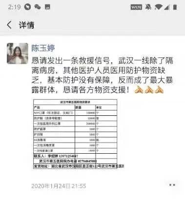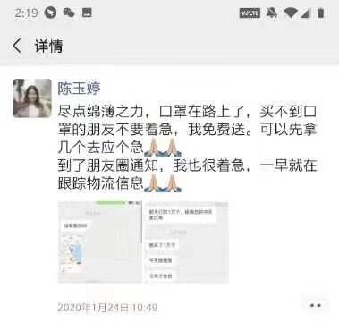 “了解追踪物资物流信息,呼吁朋友圈内共同救援,实时更新口罩等捐助信息和武汉协和医院紧缺物资情况,这是我每天都在做的事。”陈玉婷说,“但是在购买口罩期间,我也经历了一些小波折:大年初一,我收到了假口罩19000个,大年初七,我又买到假口罩3600个,损失不少钱不说,不良商家欺骗消费者的行为令人气愤。后续,我还将着重处理解决假口罩问题,同时继续呼吁救援,发动募捐,支援各家各户、支援武汉、支援社会,为疫情防控贡献自己的力量。