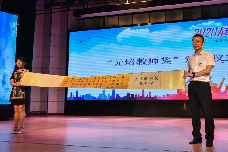 晚会上,学院教师最高奖“元培教师奖”颁奖仪式举行。学院副院长李黎宣读表彰文件。郝敬习、叶访春、沈红卫分别为获奖者纺织服装与艺术设计分院楼利琴老师、医药与健康分院杜轶君老师、经济管理分院蒋江林老师颁发颁奖词书法卷轴和荣誉证书。金汉强为三位获奖教师颁发奖金红包。石生元为三位获奖教师献花。