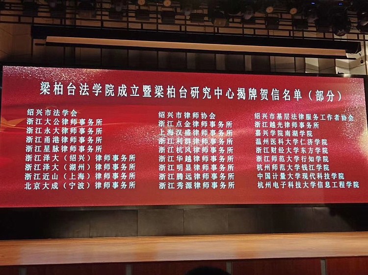 浙江省法学会党组成员、专职副会长陆剑锋、绍兴市中级人民法院院长唐学兵、绍兴市人民检察院检察长翁跃强、绍兴文理学院党委书记汪俊昌、中共新昌县委书记李宁、绍兴市人民检察院二级高级检察官、绍兴市检察学会会长、原绍兴市人民检察院党组副书记、副检察长陈理平、绍兴文理学院党委副书记郝敬习、浙江大学博导、教授翁国民、中共绍兴市委政法委常务副书记王荣彪、绍兴市教育局局长姚国海、绍兴市司法局局长黄文刚、绍兴市人民检察院检察委员会专职委员、绍兴市法学会刑法学研究会会长陶建军、绍兴市党史室副主任郑红光、绍兴市委政法委办公会议成员、市法学会专职副会长张永强、绍兴市委政法委办公会议成员、市纪委驻政法委纪检监察组组长金燕、浙江日报绍兴分社社长朱海兵、新昌县人民检察院检察长杨琦、绍兴市法学会秘书长潘海浪、学院党政领导班子成员等出席活动。出席本次成立大会的还有梁柏台家乡镇、村代表、绍兴律师协会领导、绍兴各大律师事务所负责人、学院律师校友协会代表及法学院全体师生。学院院长沈红卫主持仪式。