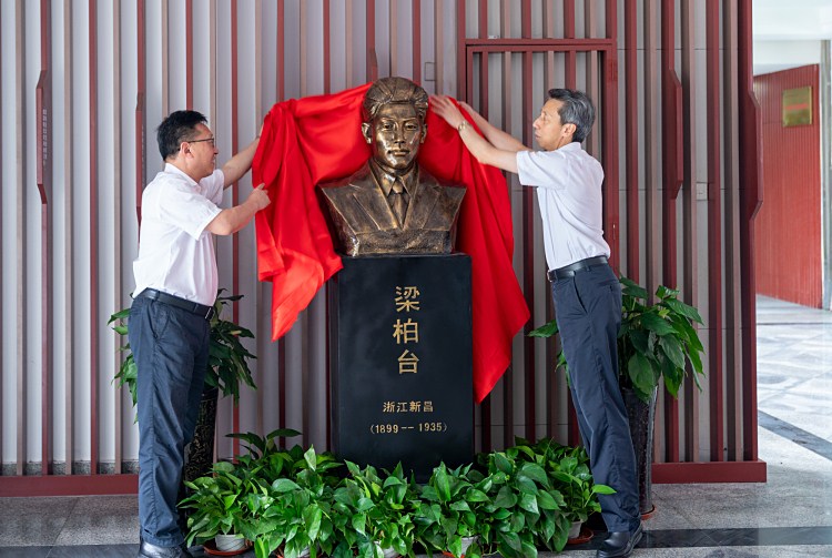 仪式结束后,领导嘉宾前往红色学府参加梁柏台纪念雕像揭幕仪式,共同参观梁柏台生平事迹展。汪俊昌和陈理平共同为梁柏台雕像揭牌。