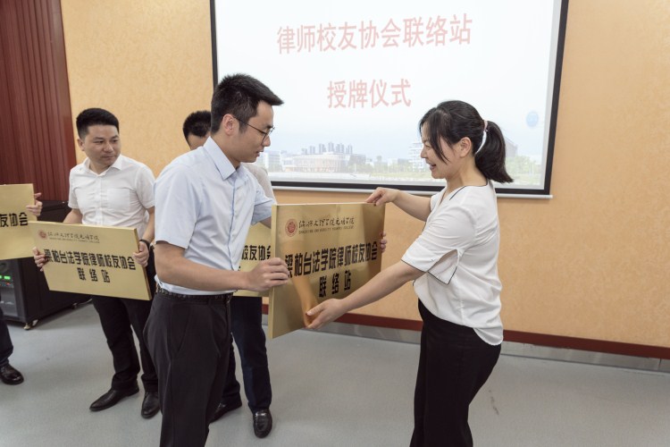 “梁柏台法学院”党总支书记陈跃男为律师校友联络站律所代表授牌