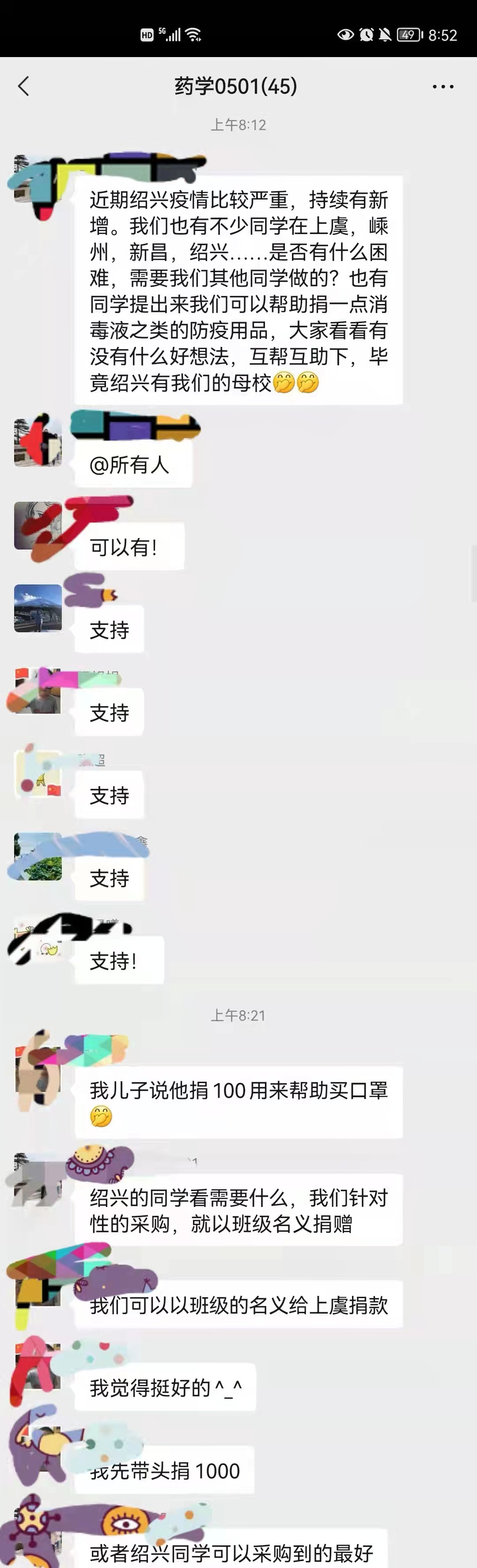“母校需要什么?”“近期绍兴疫情比较严重,是否有什么困难需要帮助?”“需要防疫用品吗?”“别怕,我们医院兵强马壮!”“大家可以互帮互助,毕竟绍兴也有我们的母校。”“大家互帮互助,共渡难关!”12月13日早上,医药与健康分院教师杜轶君刚刚打开微信,便被药学0501、药学1701两个班级群内的满屏爱心“暖”住了。药学0501班班长巴富民发起提议组织捐助后,药学0501班的梁娟娟、承雯雯、王晨曦、周伟鑫,药学07级的费晓强、王超海、杨浈,以及来自浙江、江苏、四川等全国各地的校友纷纷响应,不断地汇集起对母校和绍兴的关爱。