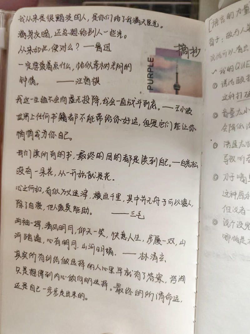 寝室的书架上,摆着几本对应沁倪意义非凡的笔记本,笔记本内页中摘录了许多励志的句子。在情绪低落的时候,应沁倪喜欢以做摘录、写日记的形式,进行自我对话,帮助自己快速找回状态,这也是她日常给自己“充电”的方式之一。“我喜欢审视自己,向内进行自我探索,每一段经历于我而言,都是一笔宝贵的财富。”在进行向内自我探索的过程中,应沁倪会对每一段经历进行阶段性的总结,回看自己的进步和不足,找到前行的下一个目标。