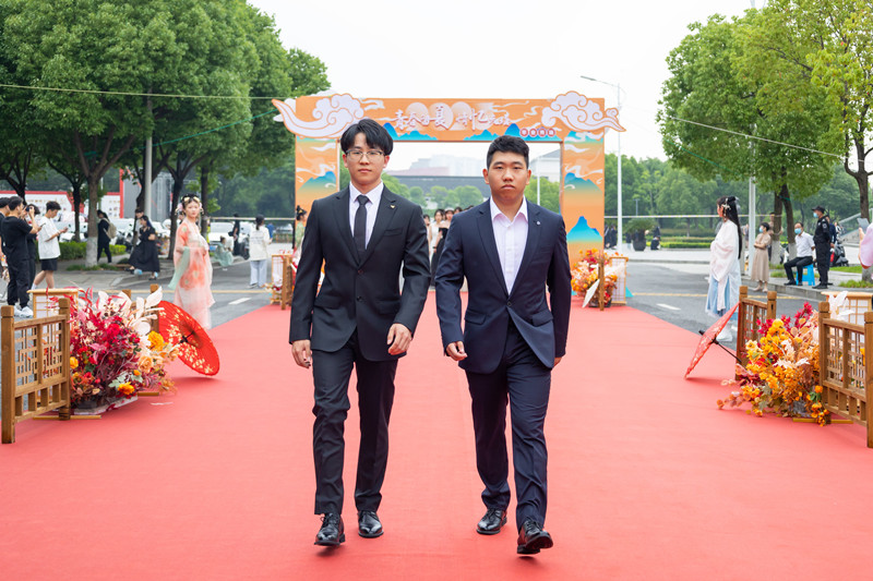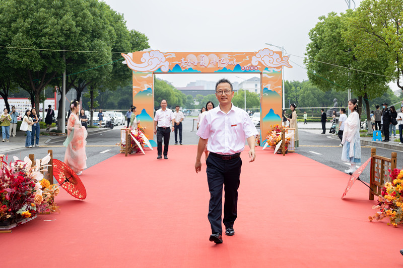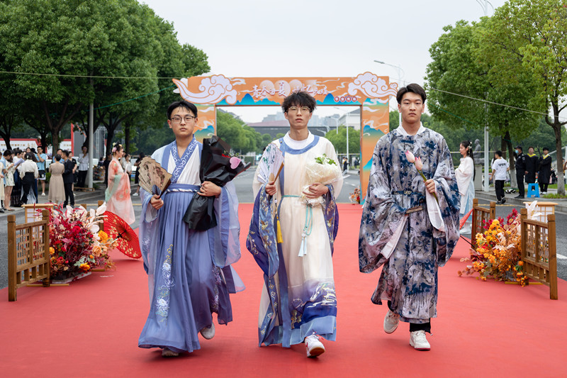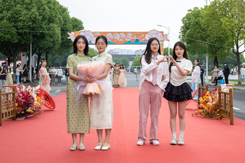 元培大道,百米红毯花团锦簇。国际文化交流中心前,欢声笑语,氛围浓烈。在主持人的介绍下,毕业生与师长、同学亲朋好友共同踏上这条寓意新征程的红毯,完成了人生中第一次“红毯秀”。他们或身着古色古香的汉服,或拿着明艳的鲜花,或手持素雅的纸扇时而带着笑容招手,时而互相寒暄打趣。电商1902班金忠行从进校起就参与到了每年的红毯筹备,今年是他参与红毯礼的第四年,“走完这趟红毯,也就意味着我正式走向人生的另一段旅程优秀毕业生代表传播1901班杨倩激动地说:走红毯既是荣誉的象征,也是我们四年学习生涯肯定,今天的我们走过了人生中最重要的一次红毯秀”计算机1903班潘佳宇与妈妈一起参加了红毯“女儿的大学四年是独立的四年,很荣幸能够参与陪伴她走完大学的最后一程。”