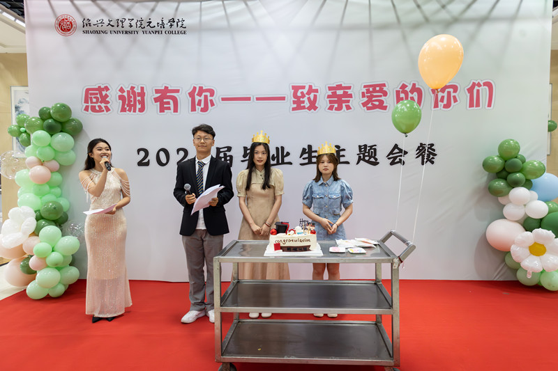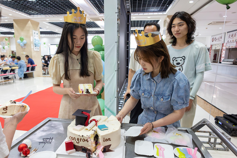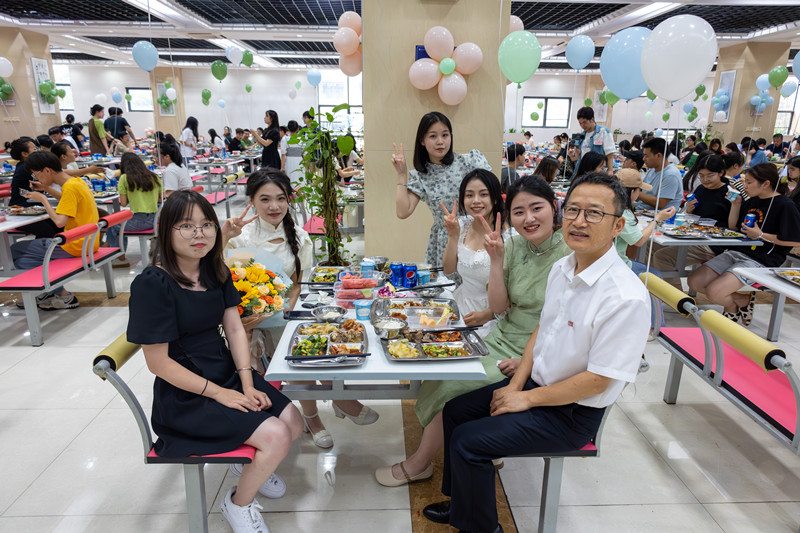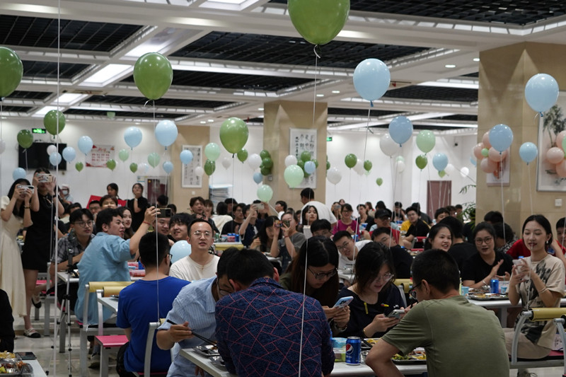红烧大虾、葱烧排骨、餐后水果……“红毯礼”结束后,毕业生带着喜悦来到群贤楼餐厅一边享受学院准备的“惊喜晚餐”,一边与好友谈论即将奔赴的“远方”。“很感谢学院组织的这次毕业聚餐,很有意义。这可能是我们最后一次坐在一起,吃着食堂好吃的饭菜了,温馨又感到幸福。”视传1902郑思悦说道。在这特殊的日子,学院特地为今天过生日的两位毕业生准备了“生日惊喜”,在一声声生日祝福和掌声中,志愿者们送上了精心准备的生日蛋糕。惊喜,没想到可以与这么多人一起过生日,感谢学院给予的满满温暖与关怀”法学1904司肖雨感慨道。