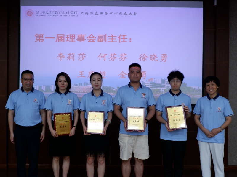 为上海校友服务中心副主任李莉莎(左二)何芬芬(左三)王康超(右三)徐晓勇(右二)颁发聘书