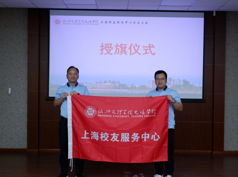 学院党委副书记石旭明为中心授旗,上海校友服务校友代表李良宵接旗
