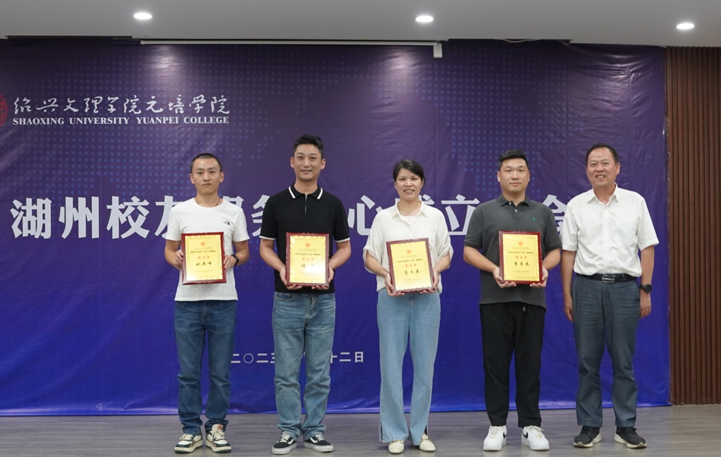 为湖州校友服务中心副主任姚燕峰(左一)楼顺(左二)高文英(左三)李萃杰(右二)颁发聘书