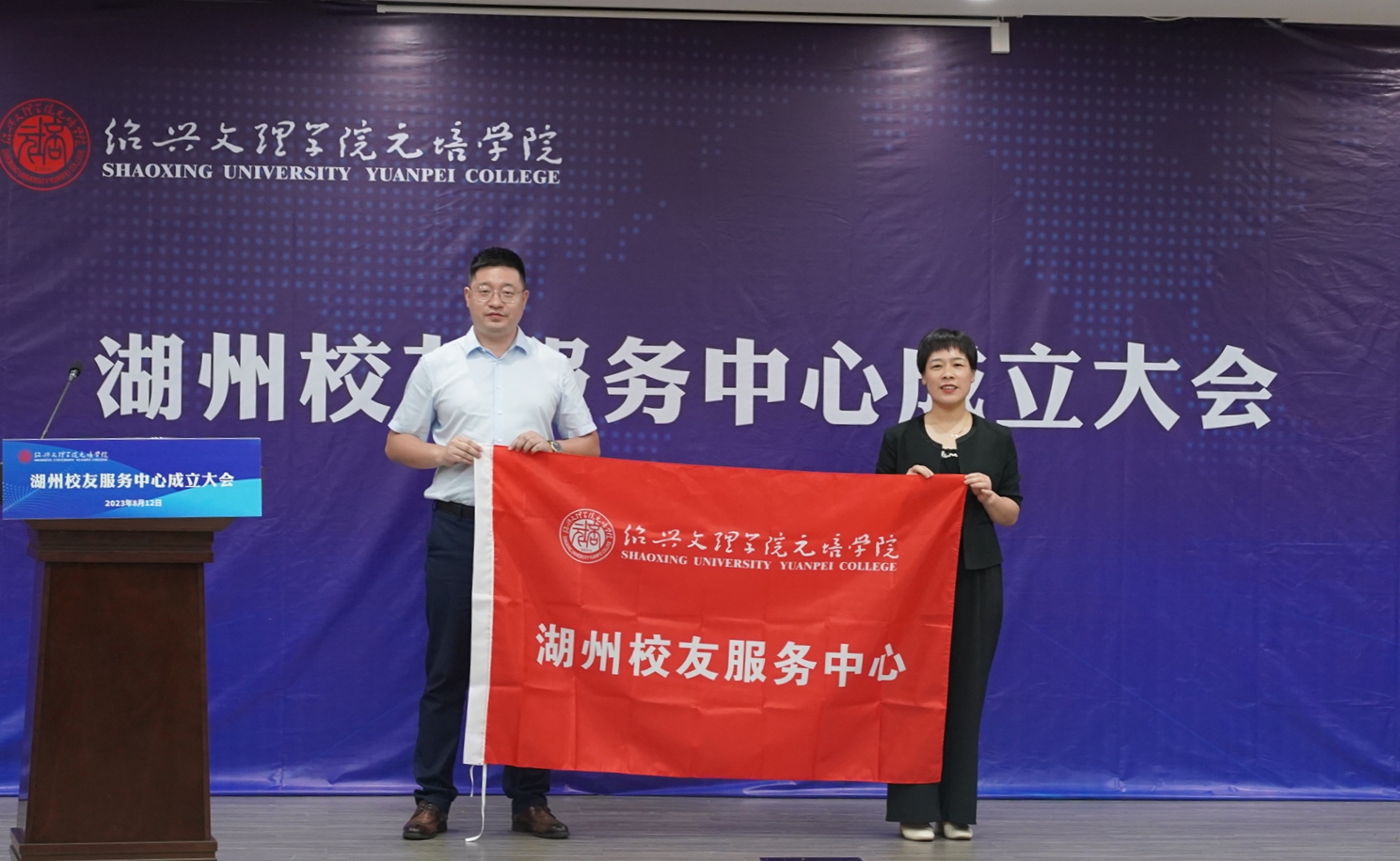 学院党委副书记、纪委书记俞国芬为中心授旗,湖州校友服务校友代表张春华接旗
