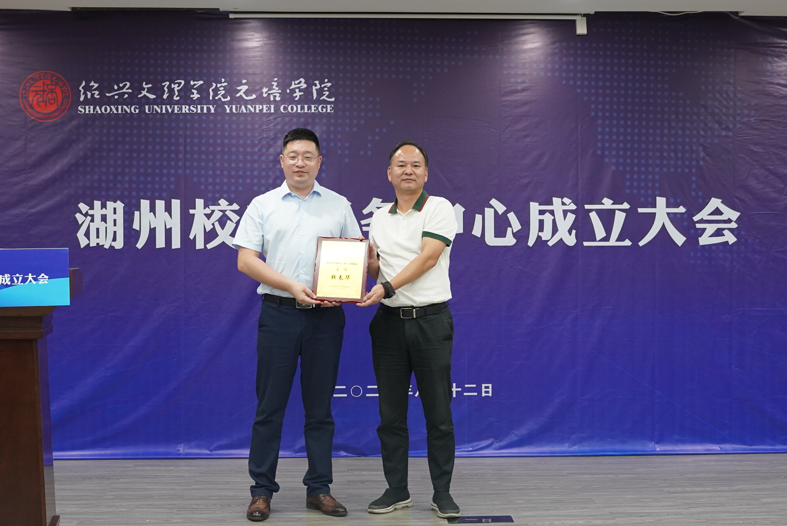 学院党委副书记石旭明为湖州校友服务中心主任张春华颁发聘书