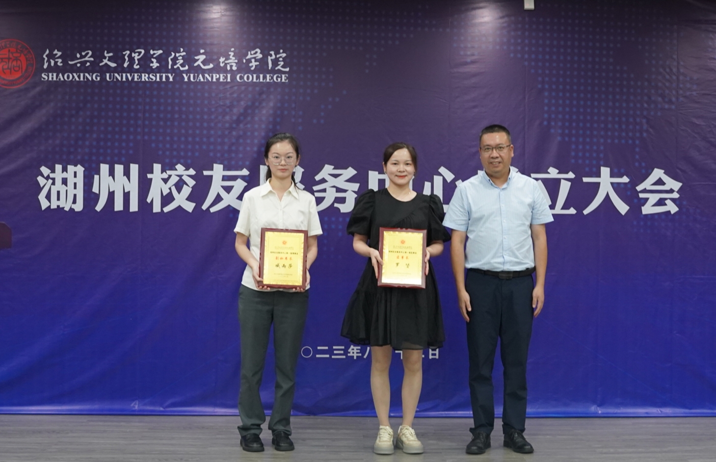 为湖州校友服务中心副秘书长臧雨莎(左一)监事长罗赟(左二)颁发颁书