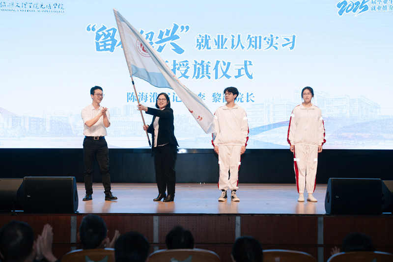 陈海淮和李黎共同为“留在绍兴”2025届毕业生就业认知实习出征团队授旗。