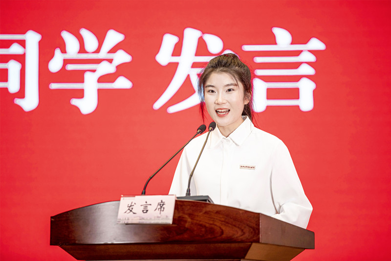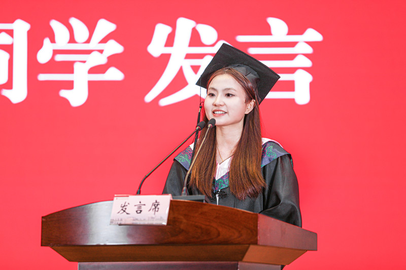 在校生代表、法学2301班贺一冉同学以青春誓约向即将离开母校走向社会的学长学姐致以诚挚祝福。