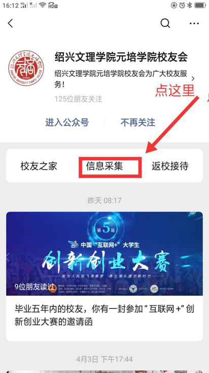 1.关注微信公众号:绍兴文理学院元培学院校友会。